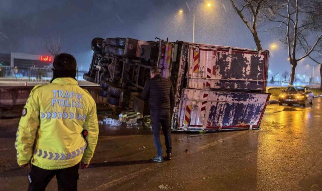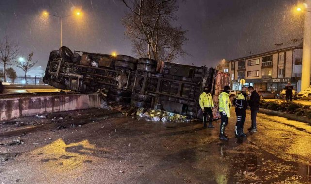 Bursa'nın İnegöl ilçesinde kontrolden çıkan içecek yüklü kamyon devrildi. Araç sürücüsü kazayı yara almadan atlattı.