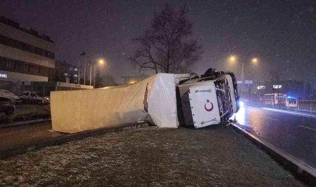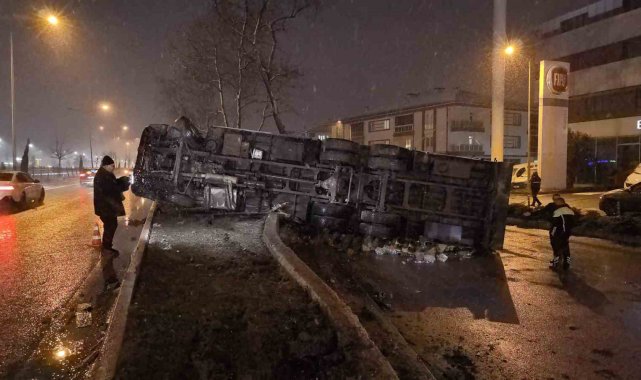 Bursa'nın İnegöl ilçesinde kontrolden çıkan içecek yüklü kamyon devrildi. Araç sürücüsü kazayı yara almadan atlattı.Kaza, saat 19.00 sıralarında Bursa-Ankara karayolu üzeri İnegöl girişinde meydana geldi. Bursa'dan İnegöl'e seyir halinde olan Bünyamin B. (47) idaresindeki 16 AVD 445 plakalı içecek yüklü kamyon, sürücüsünün kontrolünden çıkarak alt yola devrildi. Kazada sürücü yaralanmazken, dorsede bulunan tüm şişeler kırıldı. Araç çekici yardımıyla 2 saat süren çalışma sonucu kaldırıldı. Polis kaza ile ilgili soruşturma başlattı.