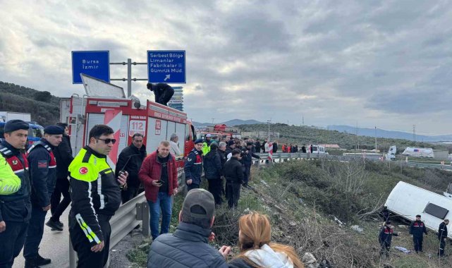 Bursa'nın Gemlik ilçesinde, işçileri taşıyan servis otobüsü, tırın arkadan çarpması sonucu şarampole yuvarlandı. 15 kişinin yaralandığı kaza bölgesine çok sayıda ambulans ve kurtarma ekibi sevk edildi.Olay, Bursa'nın Gemlik ilçesi Serbest Bölge girişinde meydana geldi. Edinilen bilgiye göre, 41 TK 262 plakalı tır, Gemlik Serbest Bölgeye girişinde hızını ayarlayamayınca 16 S 7137 plakalı Temsa marka servis otobüsüne arkadan çarptı. İşçileri topladıktan sonra fabrikaya doğru yola çıkan otobüs şoförü, çarpmanın etkisiyle direksiyon hakimiyetini kaybetti. Yaklaşık 20 metre şarampole yuvarlanan otobüste, can pazarı yaşandı.Vatandaşların ihbarıyla çok sayıda ambulans ve kurtarma ekibi bölgeye sevk edildi. Yaralılar, vatandaşların da yardımıyla otobüsten çıkarıldı.Yol, kaza sebebiyle tek şeritten sağlanırken, kazayla ilgili tahkikat devam ediyor.