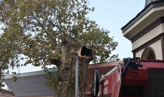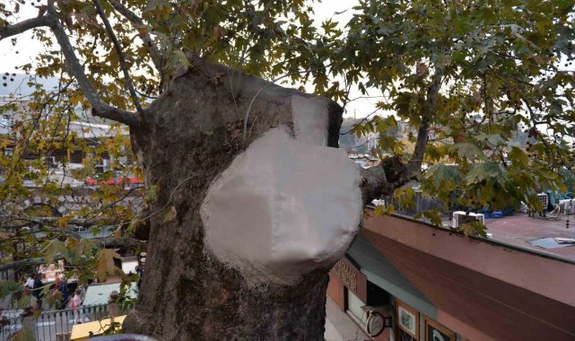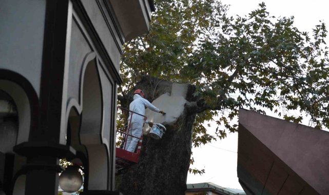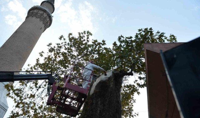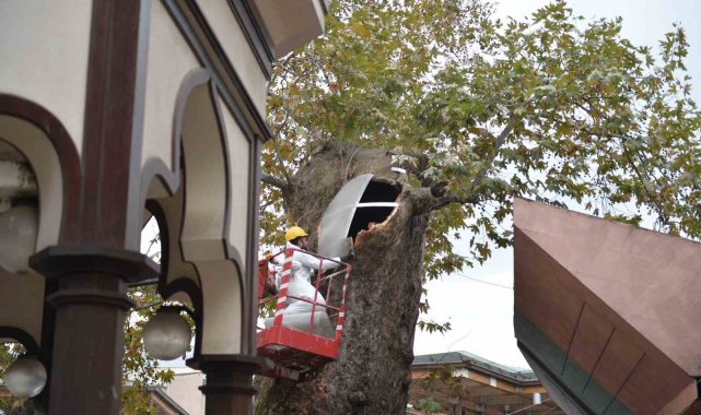 Bursa Ulu Cami'nin avlusunda yer alan ve henüz bilinmeyen bir nedenle büyük dalı kopan 346 yaşındaki asırlık çınar ağacı, Büyükşehir Belediyesi ekiplerinin bakım ve restorasyon çalışmalarıyla geleceğe taşınıyor.
