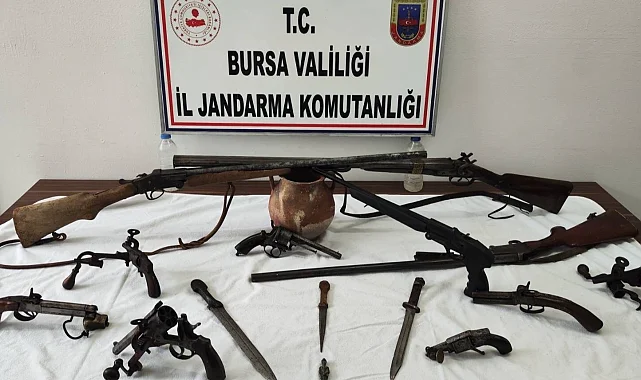 Bursa'nın Osmangazi ilçesinde Jandarma tarafından düzenlenen "Anadolu Mirası Operasyonları" kapsamında, bir şüphelinin evinde çok sayıda tarihi eser niteliğinde silah ve obje ele geçirildi.