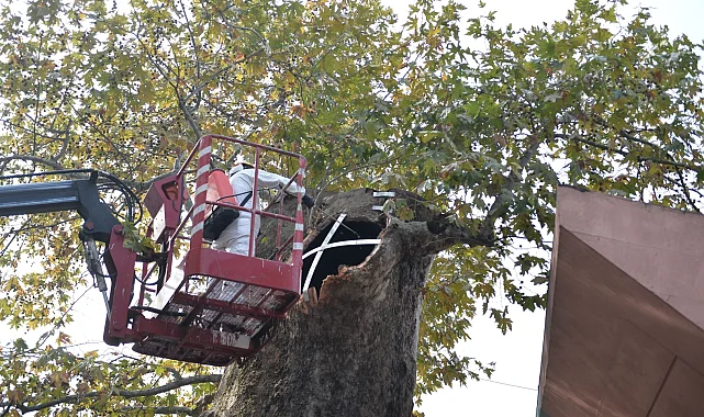 Bursa Ulu Cami'nin avlusunda yer alan ve henüz bilinmeyen bir nedenle büyük dalı kopan 346 yaşındaki asırlık çınar ağacı, Büyükşehir Belediyesi ekiplerinin bakım ve restorasyon çalışmalarıyla geleceğe taşınıyor.