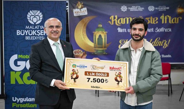 Malatya Büyükşehir Belediye Başkanı Sami Er, Turgut Özal Üniversitesinde düzenlenen bilgi yarışmasına katıldı. Üniversite öğrencilerinin heyecanına ortak olan Başkan Er, Ramazan ayı vesilesiyle çeşitli programlar ve etkinliklerin devam ettiğini söyledi.Büyükşehir Belediyesi Gençlik ve Spor Hizmetleri Daire Başkanlığı tarafından Ramazan etkinlikleri kapsamında Turgut Özal Üniversitesi Yeşilyurt yerleşkesinde kahoot bilgi yarışması düzenlenerek, müzik dinletisi sunuldu. Malatya Turgut Özal Üniversitesi Rektörü Prof. Dr. Recep Bentli ile birlikte bilgi yarışmasına katılan Büyükşehir Belediye Başkanı Sami Er, öğrencilerin yaşadığı heyecana ortak oldu.Başkan Er, gençleri Ramazan etkinliklerine davet ettiYarışmada birinci olan İbrahim Özdemir'e 7 bin 500 liralık para ödülünü takdim eden Başkan Er, "Ramazan ayı vesilesiyle çeşitli programlarımız ve etkinliklerimiz devam ediyor. Bu vesileyle şunu da ifade etmek isterim; Kutsal Emanetler Sergisi'ni Sanat Sokağı'nda sizlerin ziyaretine açtık. Hepinizi oraya da özellikle davet ediyorum. Bunun dışında Ramazan münasebetiyle düzenlediğimiz farklı etkinliklerimiz de var. Bu programları takip etmenizi ve mümkün olduğunca katılmanızı tavsiye ediyorum. Ben burada bulunmaktan gerçekten büyük bir memnuniyet duydum. Bu güzel programı tertip eden Rektör Hocamıza ve emeği geçen herkese ayrı ayrı teşekkür ediyorum. Sizler de katılımınızla bizleri onurlandırdınız, hepinize ayrıca teşekkür ediyorum" dedi.Dereceye giren öğrencilere ödülleri verildiYarışmada ikinci olan Melek Nur Çağlayan'a 5 bin liralık para ödülünü Malatya Turgut Özal Üniversitesi Rektörü Prof. Dr. Recep Bentli verdi. Rektör Bentli, Büyükşehir Belediye Başkanı Sami Er'e üniversitede düzenledikleri etkinlik dolayısıyla teşekkür etti.Bilgi yarışmasında üçüncü olan Fehime Dolaş'a 2 bin 500 liralık para ödülünü ise Malatya Turgut Özal Üniversitesi Rektör Yardımcısı Prof. Dr. İlhan Erdem takdim etti.Yarışmada ilk 10'da yer alan 7 öğrenciye ise Büyükşehir Belediyesi Gençlik ve Spor Hizmetleri Daire Başkanlığı tarafından hazırlanan destek çantası hediye edildi.Başkan Er daha sonra öğrencilere aşure ikram etti.