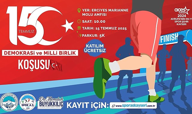 Kayseri Büyükşehir Belediyesi Spor A.Ş., 15 Temmuz Demokrasi ve Milli Birlik Günü anısına düzenlenecek anlamlı koşu etkinliğiyle vatandaşları bir araya getiriyor.Kayseri'nin spor alanındaki başarılarını artıran ve halkı spora teşvik eden Spor A.Ş., önemli ve özel günlerde düzenlediği etkinliklerle toplumsal dayanışmaya ve milli bilince katkı sağlamayı sürdürüyor.Spor A.Ş., 15 Temmuz Demokrasi ve Milli Birlik Günü'nü anlam ve önemiyle yaşatmak üzere özel bir etkinlik düzenliyor. Altın Bayrak ödüllü Büyükşehir Belediyesi Spor A.Ş., 2025 yılında da dur durak bilmeyen spor organizasyonlarıyla tüm Kayserilileri bir araya getirmeye devam ediyor.15 Temmuz'un yıldönümünde, milletin yazdığı demokrasi destanını unutmamak, birliği ve beraberliği pekiştirmek amacıyla düzenlenecek "15 Temmuz Demokrasi ve Millî Birlik Koşusu" 15 Temmuz Salı günü saat 10.00'da Erciyes Üniversitesi Marianne Molu Anfisi'nde gerçekleştirilecek.5 kilometrelik parkurda düzenlenecek koşuya katılan tüm sporcular, adımlarını demokrasi, özgürlük ve vatan sevgisi için atacak.Spor A.Ş., etkinlikte şehitleri rahmetle, gazileri ise minnetle anarak, toplumun tüm kesimlerini bu anlamlı koşuya davet etti.