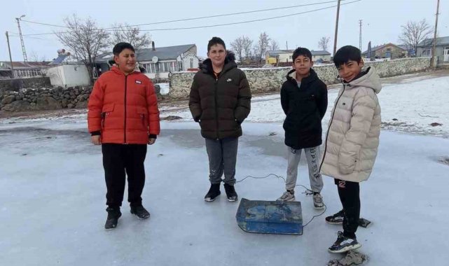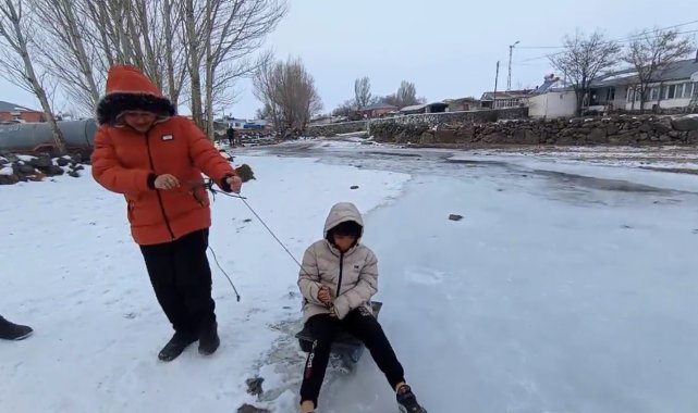Kars'ın Akyaka ilçesinde buz tutan derede kızakla kayan çocuklar sömestir tatilinin keyfini çıkarıyor.