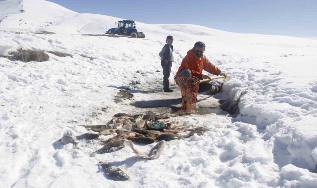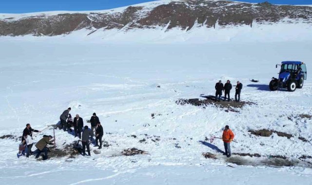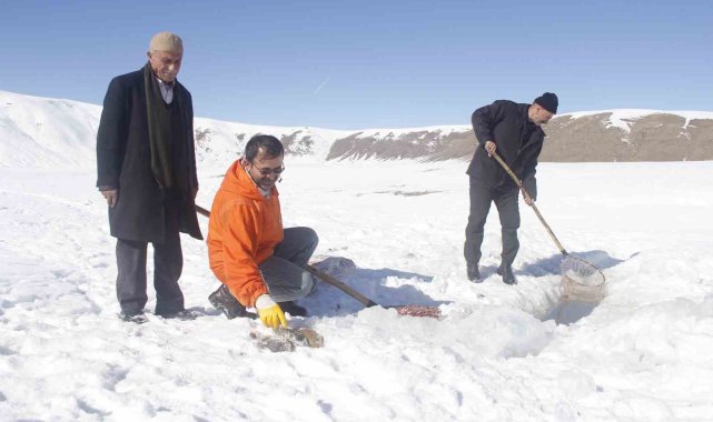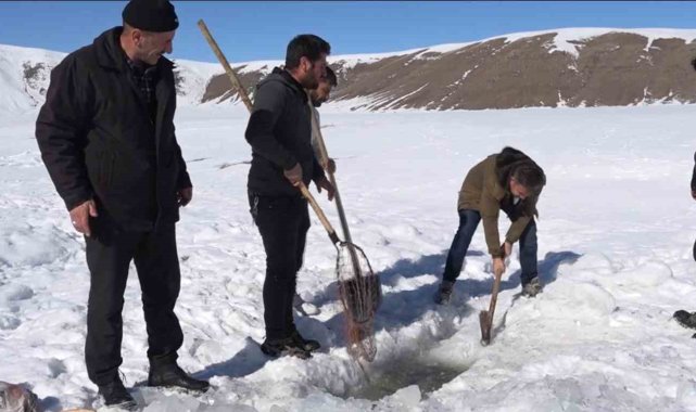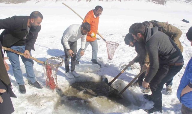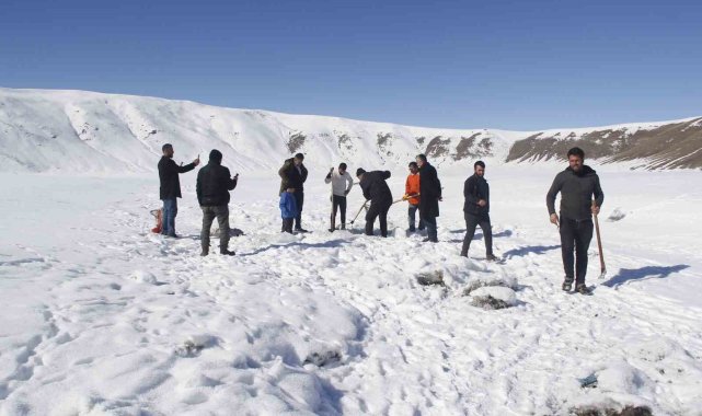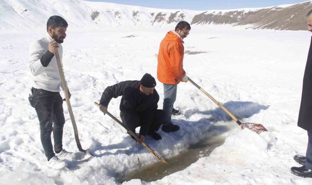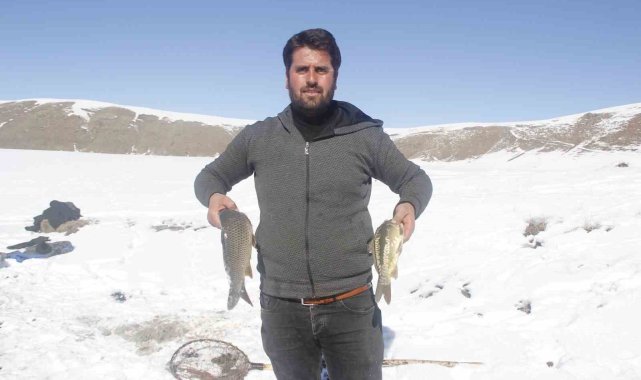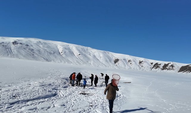 Van'ın Erciş ilçesinde buz tutan Meydan Boğazı Göletinde vatandaşlar 'Eskimo' usulü balık avlıyor.Erciş'in Pınarlı Mahallesi sınırları içerisinde bulunan Meydan Boğazı Göleti, soğuk havanın etkisiyle buzla kaplandı. 2400 rakımda bulunan ve yaz mevsiminde yeşilliğiyle köylülerin hayvanlarını otlattığı ve piknik yeri olarak kullandığı Meydan Boğazı Göleti, kışın da balık avlayan vatandaşların uğrak noktası oldu. Sadece sazan türünde balıkların yaşadığı gölette vatandaşlar kazma ve küreklerle kalın buz tabakalarını kırarak balık avlıyor.Eskimo usulü balık avlayan köylülerden Abdulbaki Çeber, "Çocukluğumdan beri bu barajda aynalı ve pullu sazan balıkları var. Bu sene havalar güzel gittiği için hem buzu azdır hem karı azdır. Havalar da güzel olduğu için ara ara gelip buzu kırıyoruz. Buzun altından çok güzel balık çıkıyor" dedi.Bilal Çeber ise inşaatçı olduğunu ve kış mevsiminde ise gölete gelerek buzu kırıp balık avladığını söyledi. Çeber, "Bugün balığa geldik, çok şükür balık bereketli çıktı. Tuttuğumuz balıkları köye götüreceğiz, köy halkına vereceğiz. Tuttuğumuz balıklar sazan balığıdır. Çok lezzetlidir. Kışın lezzeti daha çok olur" diye konuştu.