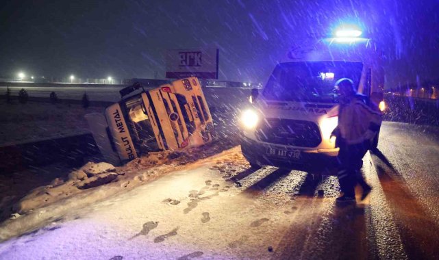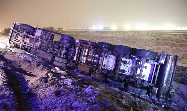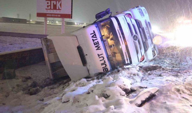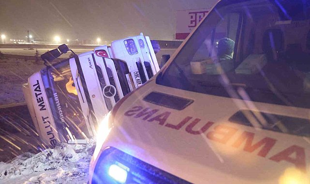 Aksaray'da buzlanan karayolunda kayan tır kontrolden çıkarak şarampole devrildi, kazada sürücü yaralandı.