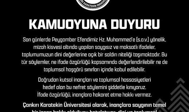 Çankırı Karatekin Üniversitesi tarafından Leman dergisinde yayımlanan Hazreti Muhammed ile Hazreti Musa'ya yönelik hakaret içeren karikatüre tepki gösterilerek kınama mesajı yayınlandı.Çankırı Karatekin Üniversitesi, sosyal medya hesabından yapılan paylaşımla Leman Dergisi'nde Hazreti Muhammed'e yönelik yayımlanan karikatüre tepki gösterdi.Açıklamada, "Son günlerde Peygamber Efendimiz Hz. Muhammed'e (s.a.v.) yönelik, mizah kısıvesi altında yapılan saygısız ve maksatlı ifadeler, toplumumuzun dini değerlerine açık bir saldırı niteliği taşımaktadır. Bu tür söylemler, ne ifade özgürlüğü kapsamında değerlendirilebilir ne de toplumsal hoşgörü sınırları içinde kabul edilebilir. Doğrudan kutsal inançları ve toplumsal hassasiyetleri hedef alan bu nefret söylemini şiddetle kınıyoruz. İfade özgürlüğü, inançlara hakaret etme hakkı vermez. Çankırı Karatekin Üniversitesi olarak, inançlara saygının temel bir insan hakkı olduğunu hatırlatıyor; dini ve toplumsal değerlerimizi hedef alan her türlü provokatif girişim karşısında durduğumuzu kamuoyuna saygıyla bildiriyoruz" ifadelerine yer verildi.
