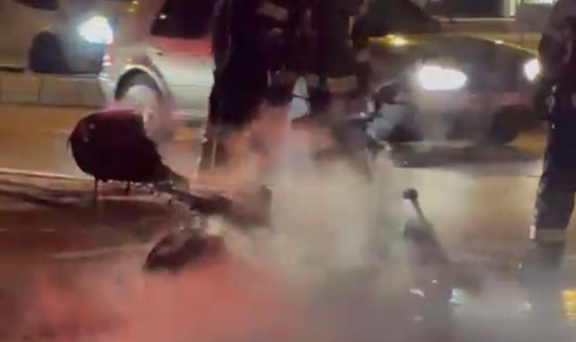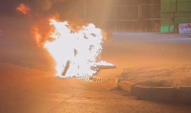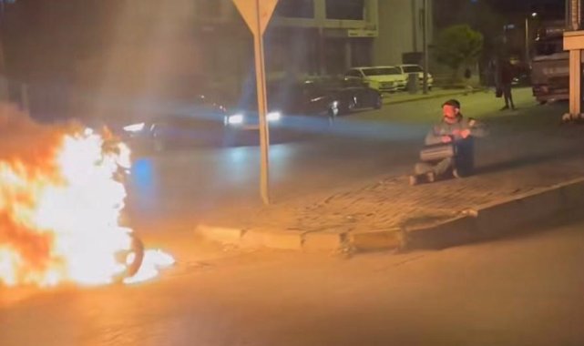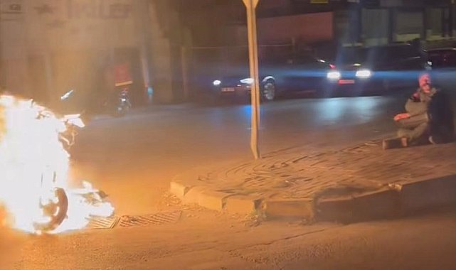 Denizli'de arıza yapan elektrikli motosikletini çalıştıramayan sürücü, aracını yolun ortasında ateşe verdi. Motosikletinin üzerine benzin dökerek ateşe veren sürücü, karşısına oturup yangını izledi.