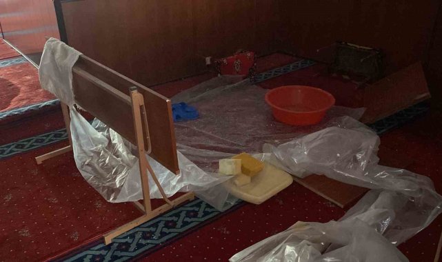 Cami tavanından sızan suya naylon branda ve leğenle önlem