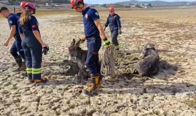 Adana'da Seyhan Baraj Gölü'nde suyun çekildiği kısımda çamura saplanan eşek vatandaşların ihbarı üzerine itfaiye ekipleri tarafından kurtarıldı.