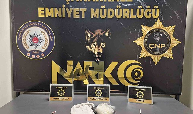 Çanakkale'de Narkotik Suçlarla Mücadele Şube Müdürlüğü ekiplerince uyuşturucu madde satışı yapan ve kullanan şahıslara yönelik düzenlenen operasyonda bir aracın yolcu koltuğunda poşet içinde piyasa değeri 3.5 milyon TL olan 1 kilo 50 gram metamfetamin ele geçirildi. 2 şüpheli tutuklandı.Çanakkale İl Emniyet Müdürlüğü Narkotik Suçlarla Mücadele Şube Müdürlüğü ekiplerince il merkezi ve ilçelerinde uyuşturucu madde satışı yapan ve kullanan şahıslara yönelik düzenlenen operasyonda bir araçta 'Lina' isimli narkotik köpeğiyle yapılan aramada aracın arka kısmındaki yolcu koltuğu altında poşet içinde piyasa değeri 3.5 milyon TL olan 1 kilo 50 gram metamfetamin ile 4 sentetik ecza, 1 içerisinde skunk bulunan sigara ele geçirildi.Narkotik Suçlarla Mücadele Şube Müdürlüğü ekiplerince şüpheliler N.K., A.Ç. ve M.T.S. gözaltına alındı. Haklarında uyuşturucu madde ticareti yapmak ve uyuşturucu madde kullanmak suçlarından işlem yapılan şüpheliler N.K., A.Ç. ve M.T.S. emniyetteki işlemlerinin ardından adliyeye sevk edildi. Şüphelilerden N.K. ve A.Ç. çıkarıldıkları mahkemece tutuklandı. Diğer şüpheli M.T.S. ise adli kontrol şartıyla serbest bırakıldı.