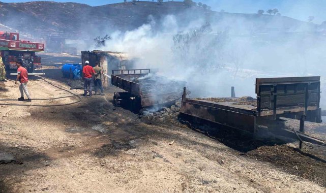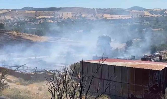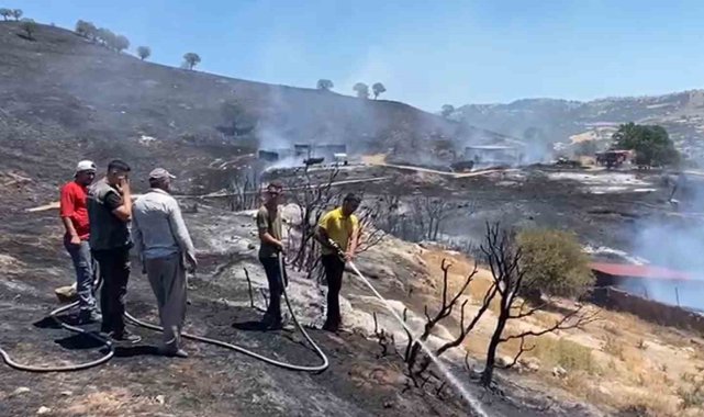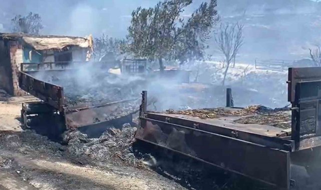 Çanakkale'nin Ayvacık ilçesine bağlı Kösedere köyünde makilik alanda çıkan yangında 3 ahır ve ağıl ile 2 traktör römorku yandı.