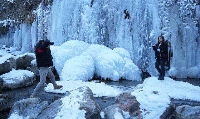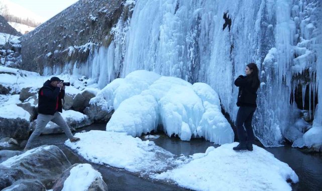 Muş'ta hava sıcaklığının sıfırın altında 15 dereceye kadar düşmesiyle Çar Çayı üzerinde bulunan şelale dondu. Metrelerce uzunluğundaki buz sarkıtları doğaseverlerin uğrak mekanı oldu.Muş'ta hava sıcaklığının sıfırın altında 15 dereceye kadar düşmesiyle Çar Çayı üzerinde bulunan şelale tamamen dondu. Metrelerce uzunluğundaki buz sarkıtlarıyla adeta görsel bir şölen sunan şelale, doğaseverlerin ve fotoğrafçıların ilgi odağı oldu. Dondurucu soğukların etkisiyle nehir, dere, gölet ve şelalelerin buz tuttuğu kentte, kartpostallık manzaralar oluştu. Özellikle Çar Çayı Şelalesi, dev buz sarkıtlarıyla görenleri hayran bırakıyor. Bölgeyi ziyaret eden fotoğrafçılar, bu eşsiz manzarayı ölümsüzleştirmek için fotoğraflarken, doğaseverler de buzla kaplanan şelalenin keyfini çıkarıyor.Muş'un doğal güzelliklerinden biri olan Çar Çayı Şelalesi, bu kış da doğanın en güzel halini sunarak ziyaretçilerini büyülemeye devam ediyor. Fotoğraflarıyla Muş'un doğasını, kültürünü ve güzelliğini tanıtan Muş Fotoğraf Derneği Başkanı Kenan Demir, "Bir hafta önce arkadaşlarla beraber dağ yürüyüşüne çıkarken Kurtik Dağı'nın eteklerinde bulunan Çar Çayı'na denk geldik. Burası muhteşem görselliği olan bir yer. Buranın fotoğraf ve videosunu çekip sosyal medya hesaplarımızda paylaşarak ilimizin saklı güzelliklerini ortaya çıkardık. Fotoğraf ve videolarımızı gören vatandaşlarımız buraya akın akın gelmeye başladılar. Her mevsimi ayrı güzel olan ilimizin tarihini, doğasını ve kültürünü konu alan yaşam fotoğrafçılığını yapıyoruz. İlimizi fotoğraflarla tanıtıyoruz" dedi.Şelaleyi ziyaret eden Şeyma Kısayol ise "Muş'un güzelliklerini keşfetmek için yollara çıktık. Burada çok güzel manzaralarla karşılaştık. Bu gezi esnasında Çar Çayı'nın buz tuttuğunu gördük. Bu güzel manzaranın fotoğraflarını çekerek anı ölümsüzleştirdik. Doğup büyüdüğümüz şehrin güzelliklerini keşfetmek bize mutluluk veriyor" ifadelerini kullandı.
