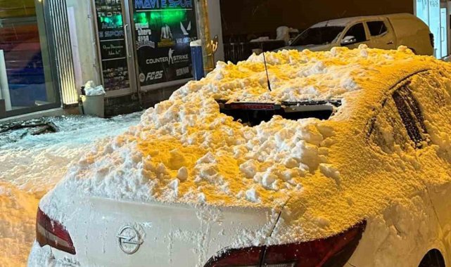 Çatıdan düşen kar kütlesi park halindeki otomobile zarar verdi