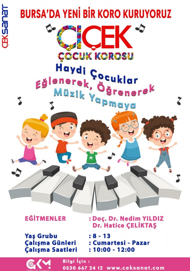 Bursa'da ÇEKSANAT 8-13 yaş arası çocukların temel müzik eğitimi almasına, birlikte şarkı söyleme yeteneğini geliştirmesine ve öğrendiklerini sergileyebilmesine olanak sağlıyor.Doç. Dr. Nedim YILDIZ ve Dr. Hatice Çeliktaş tarafından yapılacak çalışmalar Cumartesi ve Pazar günleri saat 10.00-12.00 arasında Görükle Kültür Merkezi'nde gerçekleştirilecek.Çiçek Çocuk Korosu için ilk seçmeler 6 Kasım Pazar günü yapıldı. Kayıtlar devam ediyor.Koro için ön kayıt ve Çeksanat ile ilgili diğer bilgiler için adresi ziyeret edebilirsiniz www.ceksanat.com