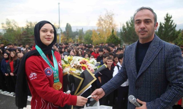 Çin'in Emeishan kentinde düzenlenen 10. Wushu Kung-Fu Dünya Şampiyonası'nda 2 altın madalya kazanarak büyük bir başarıya imza atan Sivaslı milli sporcu Afra Kılınç, arkadaşları ve öğretmenleri tarafından meşalelerle karşılandı.Çin'in Emeishan kentinde 14-20 Ekim tarihleri arasında düzenlenen 10. Wushu Kung-Fu Dünya Şampiyonası'nda Sivaslı milli sporcu Afra Kılınç, büyük bir başarıya imza attı. Kılınç, Dao Shu Stili ve Barehand Stili kategorilerinde altın madalya kazanarak dünya şampiyonu oldu.Şampiyona sonrası Sivas'a dönen Afra Kılınç için eğitim gördüğü Hacı Mehmet Sabancı Anadolu Lisesi'nde coşkulu bir karşılama töreni düzenlendi. Okul arkadaşları, genç sporcuyu meşalelerle karşılayarak sürpriz yaptı.Törende okul müdürü Erdinç Öztürk, başarılı sporcuya çiçek takdim ederken, Afra Kılınç'ın elde ettiği başarının hem okul hem de Sivas için büyük bir gurur kaynağı olduğunu belirtti.