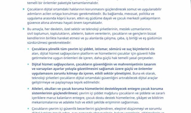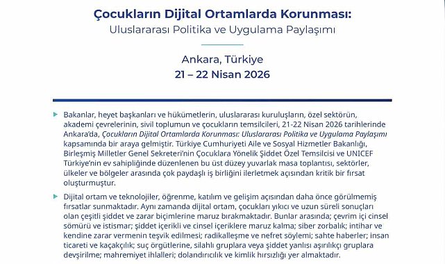 'Çocukların Dijital Ortamlarda Korunması: Uluslararası Politika ve Uygulama Paylaşımı programına ilişkin ortak sonuç bildirisi yayımlandı.Aile ve Sosyal Hizmetler Bakanlığı ev sahipliğinde Birleşmiş Milletler Çocuk Fonu (UNICEF) ve Birleşmiş Milletler (BM) Genel Sekreteri Çocuklara Yönelik Şiddet Özel Temsilciliği iş birliğiyle 'Çocukların Dijital Ortamlarda Korunmasına İlişkin Uluslararası Politika ve Uygulama Paylaşımı' programı 21-22 Nisan'da gerçekleştirildi.2 gün süren ve dijital dünyada çocukların güvenliği ile haklarının nasıl korunacağının müzakere edildiği programın ardından, çocuklar için daha güvenli dijital alanların oluşturulmasına yönelik öncelik alanları ve çözüm yollarını içeren bir sonuç bildirisi yayımlandı. Bildiride, çevrim içi platformlarda çocukların güvenliğinin sağlanmasına yönelik ortak irade vurgulandı. Ayrıca, daha güçlü hak temelli yasal çerçevelerin belirlenmesi, dijital hizmet sağlayıcıların, güvenliği artırabilecek önlemler almasının zorunlu kılınması, aileleri, okulları ve çocuk koruma hizmetlerini destekleyecek entegre çocuk koruma sistemlerinin güçlendirilmesi, genişletilmiş dijital okuryazarlık ve farkındalık artırma çalışmalarının yapılması, Çocukların çözümün bir parçası olarak sürece dahil edilmesi gerekliliği üzerinde duruldu.Aile ve Sosyal Hizmetler Bakanlığı, Birleşmiş Milletler Çocuk Fonu (UNICEF) ve Birleşmiş Milletler (BM) Genel Sekreteri Çocuklara Yönelik Şiddet Özel Temsilciliği tarafından yayımlanan ortak bildiri kapsamında çocuklar ve gençlerin dijital yaşamlarını etkileyen kararlara dahil edilmesi gerektiği belirtildi.Toplantıda küresel, bölgesel ve ulusal düzeylerde yasal ve yargısal adımlar atıldığı aktarılan bildiride, "Çocukların dijital deneyimlerini şekillendirmede kritik rol oynayan dijital hizmet sağlayıcıların ve suç faillerinin hesap verebilirliği güçlendirmiştir. Ancak bugüne kadarki çabalar, ihtiyaç duyulan sonuçları ortaya koyamamıştır. Atılan adımlar, dijital ortamdaki hızlı değişimlerin ve çocukların bu ortama erişimindeki dönüşümün gerisinde kalmaktadır" ifadeleri kullanıldı.Bildiride ayrıca, çocukların dijital ortamdaki haklarının korunmasını güçlendirecek somut ve uygulanabilir adımların acilen ortaya konulması gerektiği vurgulanarak, bu bağlamda, mevzuat, politika ve uygulama arasında köprü kuran, etkin eş güdüme dayalı ve çocuk merkezli yaklaşımların güvence altına alınmasının hayati önem taşıdığı belirtildi.Her devletin özel sektör ve teknoloji şirketlerinin, meslek uzmanlarının, sivil toplumların, toplulukların, ailelerin, bakım verenlerin, çocukların ve gençlerin bizzat kendilerinin birlikte hareket etmesi gerektiği ifade edilen açıklamada, hangi alanlarda neler yapılacağına ilişkin şunlar kaydedildi:"Çocuklara yönelik tüm çevrim içi şiddet, istismar, sömürü ve suç biçimlerini ele alan, dijital hizmet sağlayıcıların platform ve hizmetlerini çocuklar için güvenli hale getirmelerine uygun önlemleri de içeren, daha güçlü hak temelli yasal çerçeveler. Dijital hizmet sağlayıcıların, çocukların güvenliğinin ve mahremiyetinin tasarım ve varsayılan ayarlar yoluyla gözetilmesini sağlamak üzere güçlü ve önlemler uygulamasını zorunlu kılmayı da içeren, etkili sektör yönetişimi. Buna ek olarak, teknoloji şirketleri çocukların dijital ortamdaki güvenliğini artırabilecek dijital araçlar geliştirmeye ve paylaşmaya teşvik edilmelidir. Aileleri, okulları ve çocuk koruma hizmetlerini destekleyecek entegre çocuk koruma sistemlerinin güçlendirilmesi; çevrim içi şiddet mağduru çocukların ve şiddete ve zararlı içeriklere maruz kalanların entegre, çocuk dostu destek hizmetlerine, şikayet ve bildirim mekanizmalarına ve adalete hızlı ve etkili şekilde erişiminin sağlanması. Çocukların çevrim içi güvenlik becerilerini güçlendiren, eleştirel düşünmeyi ve sorumlu dijital katılımı teşvik eden, aynı zamanda ebeveynlerin, bakım verenlerin, eğitimcilerin ve diğer meslek uzmanlarının kapasitesini geliştiren, genişletilmiş dijital okuryazarlık ve farkındalık artırma çalışmaları. Çocukların çözümün bir parçası olarak dahil edilmesi; güvenli, kapsayıcı ve çocukların gelişen kapasitelerine saygılı katılım yolları sunularak, dijital yaşamlarını etkileyen kararlara anlamlı katılımlarının sağlanması. Özellikle kolluk kuvvetleri, adalet sektörleri ve mağdur desteği bağlamında, bilgi paylaşımını, akranlar arası etkileşim ve eğitimi de içeren uluslararası iş birliği."Bildiride, çocukların dijital ortamlarda karşı karşıya kaldığı risklerin gerçek olduğu anlatılarak "Bu yuvarlak masa toplantısı, tepkisel önlemlerden önleyici, hak temelli eyleme kararlılıkla geçilmesi ve dijital ortamın her çocuk için güvenli ve yararlı hâle getirilmesi yönünde ivme oluşturma yolunda çok taraflı önemli bir adımdır" denildi.