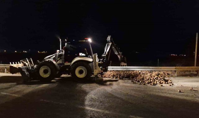 Çorum'un Alaca ilçesinde otomobil ile şeker pancarı yüklü tırın çarpışması neticesinde meydana gelen trafik kazasında 3 kişi yaralandı. Kaza anı güvenlik kamerasına yansıdı.Kaza, Alaca ilçesi Çorum-Yozgat çevre yolu Zile Kavşağı'nda meydana geldi. Edinilen bilgiye göre, Zile istikametinde seyir halinde olan Nursait Y. idaresindeki 34 VMV 65 plakalı BMW marka otomobil, kavşakta Çorum istikametinde seyir halinde olan Ali Oktay Ö. yönetimindeki 66 DZ 272 plakalı tır ile çarpıştı. Çarpmanın etkisiyle savrulan tır devrildi. Tırın dorsesinde bulunan şeker pancarları ise yola savruldu. Kazada sürücüler ile otomobilde yolcu olarak bulunan Ahmet Y. yaralandı.Kazayı gören diğer sürücülerin ihbarı üzerine olay yerine sağlık ve polis ekipleri sevk edildi. Yaralılar, sağlık ekiplerince olay yerinde yapılan ilk müdahalenin ardından Alaca Devlet Hastanesine kaldırıldı. Hayati tehlikesi bulunan tır sürücüsü, daha sonra Çorum Hitit Üniversitesi Erol Olçok Eğitim ve Araştırma Hastanesine sevk edildi.Yola saçılan şeker pancarları sebebiyle Yozgat istikameti yaklaşık 2 saat ulaşıma kapandı. Alaca Belediyesi ekipleri tarafından yapılan temizlik çalışmasının ardından yol trafiğe açıldı.Kaza anı ise güvenlik kamerasına yansıdı. Görüntülerde tır ile otomobilin kavşakta çarpıştığı, savrulan tırın yan yattığı ve dorsesindeki şeker pancarlarının yola saçıldığı anlar yer aldı.Kazayla ilgili inceleme başlatıldı.