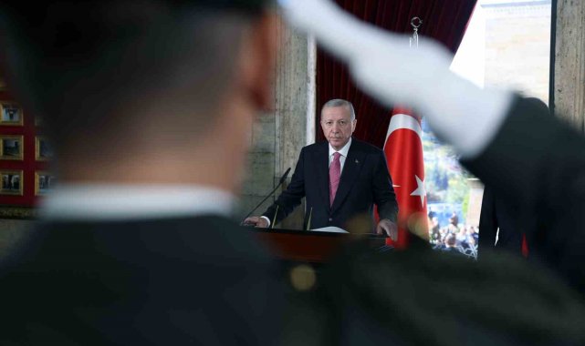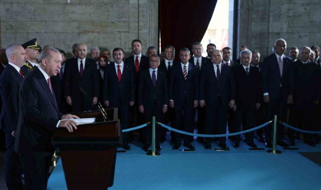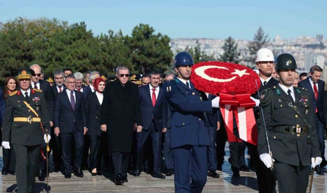 Cumhurbaşkanı Erdoğan, törende Türkiye Büyük Millet Meclisi (TBMM) Başkanı Numan Kurtulmuş, Cumhurbaşkanı Yardımcısı Cevdet Yılmaz, CHP Genel Başkanı Özgür Özel, MHP Genel Başkanı Devlet Bahçeli, Cumhurbaşkanlığı Kabinesi üyeleri, Yüksek Yargı üyeleri ile birlikte Aslanlı Yol'dan geçerek üzerinde ay yıldız bulunan çelengi Atatürk'ün mozolesine bıraktı. Törende saygı duruşunda bulunularak, İstiklal Marşı'nın okunmasının ardından Erdoğan ve beraberindekiler, Misak-ı Milli Kulesi'ne geçti. Cumhurbaşkanı Erdoğan, burada Anıtkabir Özel Defteri'ne şunları yazdı: