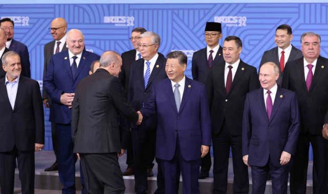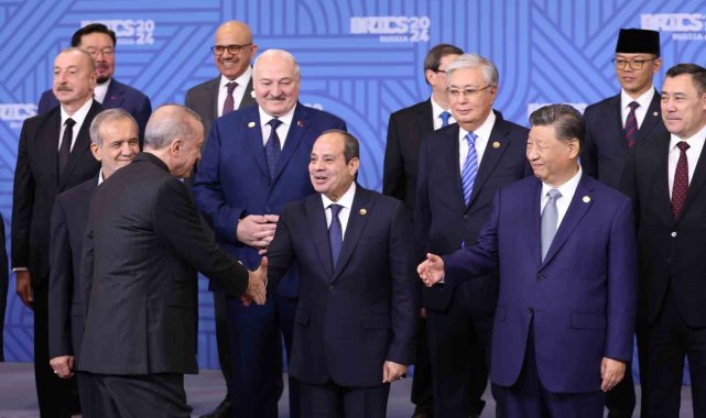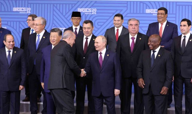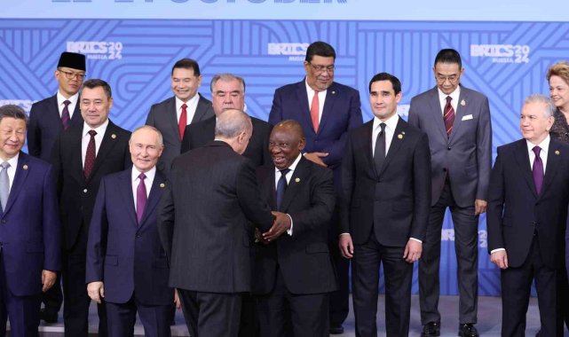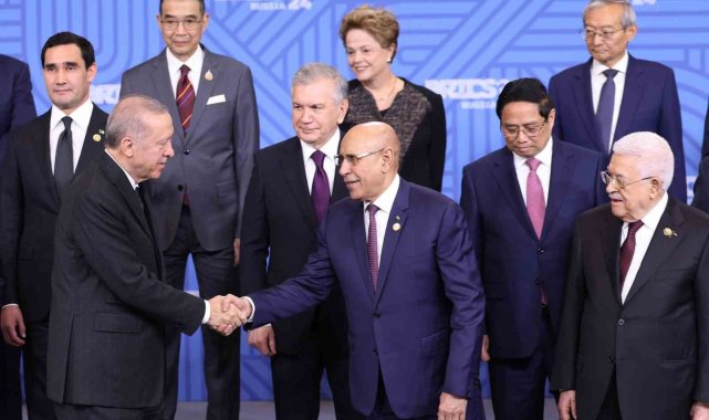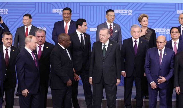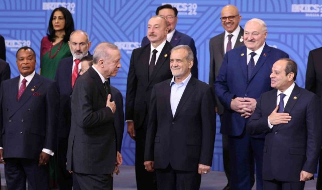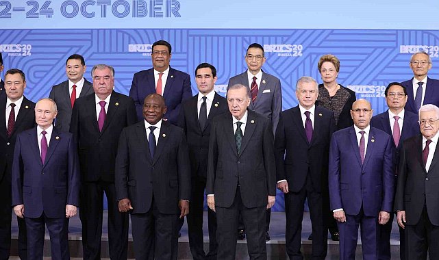 Cumhurbaşkanı Recep Tayyip Erdoğan, BRICS Liderler Zirvesi kapsamında aile fotoğrafı çekimine katıldı.Cumhurbaşkanı Recep Tayyip Erdoğan, Rusya'ya bağlı Tataristan'ın başkenti Kazan'da düzenlenen BRICS Liderler Zirvesi kapsamında aile fotoğrafı çekimine katıldı. Fotoğraf çekiminde Cumhurbaşkanı Erdoğan'ın sağında Güney Afrika Devlet Başkanı Cyril Ramaphosa, solunda Moritanya Devlet Başkanı Muhammed Veled Gazvani yer aldı. Erdoğan, fotoğraf çekiminin ardından Güney Afrika Devlet Başkanı Ramaphosa ile selamlaştı. Liderler daha sonra zirvenin düzenlendiği salona geçti.