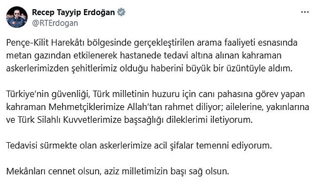 Cumhurbaşkanı Recep Tayyip Erdoğan, Pençe-Kilit bölgesinde arama faaliyetleri sırasında şehit olan 5 asker için taziye mesajı yayımladı.Cumhurbaşkanı Recep Tayyip Erdoğan, Pençe-Kilit Harekatı bölgesinde metan gazından etkilenerek şehit olan 5 asker için taziye mesajı yayımladı. Cumhurbaşkanı Erdoğan mesajında, "Pençe-Kilit Harekâtı bölgesinde gerçekleştirilen arama faaliyeti esnasında metan gazından etkilenerek hastanede tedavi altına alınan kahraman askerlerimizden şehitlerimiz olduğu haberini büyük bir üzüntüyle aldım. Türkiye'nin güvenliği, Türk milletinin huzuru için canı pahasına görev yapan kahraman Mehmetçiklerimize Allah'tan rahmet diliyor; ailelerine, yakınlarına ve Türk Silahlı Kuvvetlerimize başsağlığı dileklerimi iletiyorum. Tedavisi sürmekte olan askerlerimize acil şifalar temenni ediyorum. Mekanları cennet olsun, aziz milletimizin başı sağ olsun" dedi.
