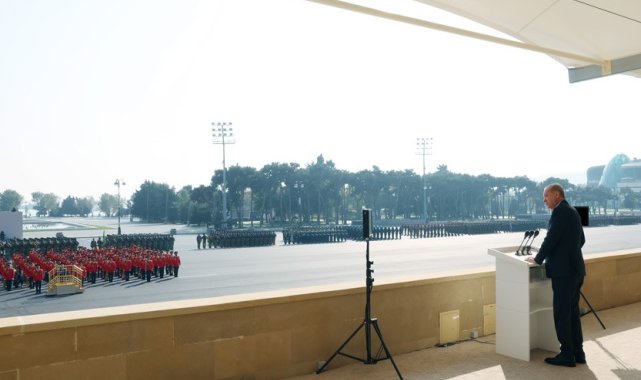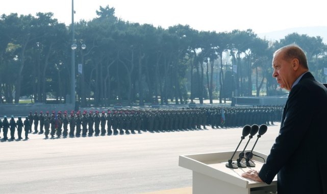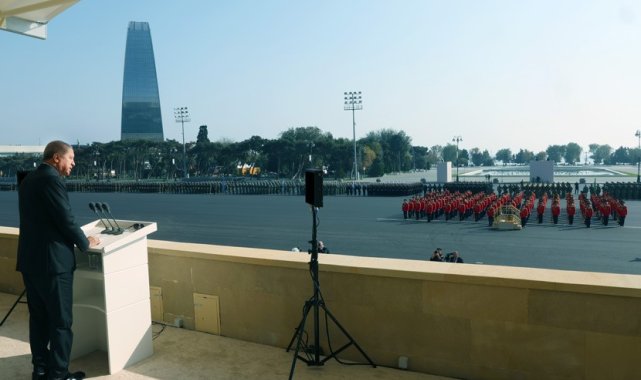 Cumhurbaşkanı Erdoğan, Bakü'de düzenlenen 8 Kasım Zafer Günü Töreni'nde yaptığı konuşmada, "Bu zaferi bir son olarak değil, Kafkasya'da kalıcı barışa giden yolun kilometre taşı olarak görüyoruz. Biz kalıcı barış noktasında son derece ümit varız, iyimseriz. İlham Aliyev kardeşimin kalıcı barışın tesisi için gösterdiği samimi çabaları takdirle karşılıyoruz. Ermenistan Başbakanı Sayın Paşinyan'ın da bu yolda attığı cesur adımları memnuniyetle takip ediyoruz. İnşallah bu muhteşem zafer her iki liderin yapıcı tavrıyla bölgede huzuru ve barışı takip edecek kalıcı bir anlaşmayla neticelenecektir" dedi.Cumhurbaşkanı Recep Tayyip Erdoğan, Azerbaycan'ın başkenti Bakü'de Karabağ Zaferi'nin 5. yıl dönümünde düzenlenen 8 Kasım Zafer Günü Töreni'ne katılarak konuşma yaptı. Cumhurbaşkanı Erdoğan, Zafer Günü'nün 5. yıl dönümünde Bakü'de bulunmaktan mutluluk duyduğunu belirterek, "Sizlere Türkiye'deki kardeşlerinizin selamlarını getirdim. Bu gurur günümüzde inanıyorum ki şu anda Türk Devletleri Teşkilatı'ndaki kardeşlerimiz de bizimle aynı coşkuyu yaşıyor. Zaferimiz kutlu olsun. Cenabı Allah, Azerbaycan'ı ve Türk dünyasını nice zaferlere kavuştursun. Azerbaycan'ın sevincini paylaşan Pakistan Başbakanı Şahbaz kardeşim başta olmak üzere bugün aramızda olan dost ülkelerden tüm temsilcilere teşekkür ediyorum" dedi. Erdoğan, "Bugün hep beraber 30 yıllık işgali sonlandıran muhteşem ve muazzam bir zaferin 5. yıl dönümünü kutluyoruz. Vatan muharebesinde toprağa düşen tüm şehitlerimizi, Azerbaycan'ın yiğit evlatlarını bir kez daha rahmetle yad ediyorum. Rabbim şehitlerimizin ruhlarını şad, mekanlarını inşallah cennet eylesin" ifadelerini kullandı."Karabağ'ın işgalden kurtarılması Türk dünyası için de büyük bir gurur vesilesidir"Erdoğan, "Kalpleri her seferinde vatan diye çarpan kahraman gazilerimize minnet duygularımı ifade ediyor, yüce Allah onlardan razı olsun diyorum. Hayatları pahasına verdikleri destansı mücadele ile 30 yıllık işgali sona erdiren Azerbaycan Silahlı Kuvvetleri'nin tüm mensuplarını bir kez daha tebrik ediyorum. Aynı şekilde bu büyük zaferin mimarı ve lideri olan İlham Aliyev kardeşimi canı gönülden tebrik ediyor, başarılarının daim olmasını diliyorum. Bilmenizi isterim ki Karabağ'ın işgalden kurtarılması sadece Azerbaycan için değil, Türk dünyası için de büyük bir gurur vesilesidir. Azerbaycan ordusunun Karabağ toprağında attığı her adım, istiklal ve izzet uğruna dökülen her damla kan, Türk dünyasının tarihinde birer şeref nişanesi olarak ortak tarihimize altın harflerle yazılmıştır. Bugün burada Azerbaycan askeri, Türkiye'den gelen asker kardeşleriyle omuz omuza, yan yanadır. Askerlerimize baktıkça 'iki devlet, tek millet' şiarının ne demek olduğunu hepimiz görebiliyoruz. Şehitlerimizin birbirine karışan kanlarının üzerinde yükselen hürriyet sancağı, Karabağ'ın dört bir yanında şanla, şerefle, gururla dalgalanıyor" diye konuştu."Biz kalıcı barış noktasında son derece ümitvarız"Erdoğan, "İlham kardeşimin dirayetli liderliği altında Azerbaycan ordusu, Karabağ'ı işgalden kurtararak gönüllerdeki 30 yıllık yangını söndürdü. Allah'a hamdolsun bugün Laçın'dan Şuşa'ya, Zengilan'dan Hankendi'ye, Hocalı'dan Fuzuli'ye kadar Karabağ'ın her karışında huzur, kalkınma, barış, refah ve özgürlük var. İnşallah bu barış ve güven iklimi daha da güçlenmeye devam edecek. Karabağ zaferi, vicdanları kanatan büyük bir adaletsizliği sonlandırmakla kalmadı, aynı zamanda bölgemizde yeni bir dönemin kapılarını araladı. Vatan Muharebesi, Asya ve Avrupa'daki jeopolitik dengeleri de değiştirdi. Biz ne kin tutarız, ne de geçmişteki acıların tekrar yaşanmasına izin veririz. Dolayısıyla bu zaferi bir son olarak değil, Kafkasya'da kalıcı barışa giden yolun kilometre taşı olarak görüyoruz. Kafkasya'da barışın hakim olmasının Asya'dan Avrupa'ya tüm bölgenin refahına hizmet edeceği kanaatindeyiz. Şunu da burada özellikle vurgulamak isterim. Biz kalıcı barış noktasında son derece ümitvarız, iyimseriz. İlham Aliyev kardeşimin kalıcı barışın tesisi için gösterdiği samimi çabaları takdirle karşılıyoruz. Ermenistan Başbakanı Sayın Paşinyan'ın da bu yolda attığı cesur adımları memnuniyetle takip ediyoruz. İnşallah bu muhteşem zafer her iki liderin yapıcı tavrıyla bölgede huzuru ve barışı takip edecek kalıcı bir anlaşmayla neticelenecektir. Türkiye olarak bu konuda üzerimize ne düşüyorsa inşallah bunu yapmaya devam edeceğiz" ifadelerini kullandı."Hazar geçişli Doğu-Batı Orta Koridoru'nu bölgedeki tüm kardeşlerimizin faydasına olacak şekilde yatırımlarla geliştirmemiz gerekiyor"Azerbaycan'ın hem bölgesinde hem de ötesinde kaydettiği ilerlemeden büyük bir kıvanç duyduklarını vurgulayan Erdoğan, " Aramızdaki müstesna ilişkiler, somut ve stratejik projelerle her geçen gün daha da güçleniyor. Hatırlayacaksınız, Asrın Projesi, Azeri-Çırak-Güneşli başta olmak üzere Bakü-Tiflis-Ceyhan Ham Petrol Boru Hattı, Şah Deniz ve TANAP ile taçlandırdığımız iş birliğimizi son olarak Iğdır-Nahçıvan Doğalgaz Boru Hattı'nın faaliyete geçmesiyle daha da perçinledik. Şimdi bu iş birliğimizi daha da ileriye götürmenin ve kapsamını geliştirmenin gayreti içindeyiz. Kafkasya'da tesis edilecek yeni rotaların ulaştırma ve enerji iletim imkanlarını artırmasını temenni ediyoruz. Hazar geçişli Doğu-Batı Orta Koridoru'nu bölgedeki tüm kardeşlerimizin faydasına olacak şekilde yatırımlarla geliştirmemiz gerekiyor. Bilhassa Bakü-Tiflis-Kars Demiryolu hattını en verimli şekilde kullanmak için Azerbaycan'la beraber çok daha ileri adımlar atacağımıza inanıyorum" dedi."