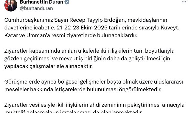 Cumhurbaşkanı Recep Tayyip Erdoğan, 21-23 Ekim 2025 tarihlerinde Kuveyt, Katar ve Umman'a resmi ziyaretlerde bulunacak.Cumhurbaşkanlığı İletişim Başkanı Burhanettin Duran yaptığı açıklamada, Cumhurbaşkanı Erdoğan'ın mevkidaşlarının davetlerine icabetle 21-23 Ekim tarihlerinde sırasıyla Kuveyt, Katar ve Umman'ı ziyaret edeceğini bildirdi.Duran, ziyaretler kapsamında Türkiye ile anılan ülkeler arasındaki ikili ilişkilerin tüm boyutlarıyla ele alınacağını belirterek, mevcut iş birliğinin daha da geliştirilmesine yönelik çalışmaların değerlendirileceğini ifade etti.Cumhurbaşkanlığı İletişim Başkanı Duran görüşmelerde ayrıca bölgesel gelişmelerin yanı sıra uluslararası meseleler hakkında da istişarelerde bulunulmasının öngörüldüğünü aktardı.Duran, ziyaretler vesilesiyle ikili ilişkilerin ahdi zeminini güçlendirmek amacıyla muhtelif anlaşmaların imzalanmasının da planlandığını kaydetti.