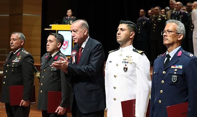 Cumhurbaşkanı Recep Tayyip Erdoğan, MSÜ Kurmay Subaylar Mezuniyet Töreni'nde yaptığı konuşmada, büyük ve güçlü Türkiye'yi inşa etmenin temel vazife olduğunu vurguladı. Erdoğan, terörsüz bir bölge hedefiyle tarihi adımlar attıklarını belirtti.İSTANBUL (İGFA) - Cumhurbaşkanı Recep Tayyip Erdoğan, Milli Savunma Üniversitesi (MSÜ) Kurmay Subaylar Mezuniyet Töreni'nde önemli açıklamalarda bulundu.Konuşmasında, şehit ve gazilerden emanet alınan toprakları daha güçlü bir şekilde geleceğe taşımanın en temel görevleri olduğunu ifade eden Cumhurbaşkanı Erdoğan, "Büyük ve güçlü Türkiye'yi inşa etmek vazifemizdir" dedi.Cumhurbaşkanı Erdoğan, "Terörsüz Türkiye ve terörsüz bölge hedeflerimize doğru kararlı, ümitli ve dikkatli bir şekilde ilerliyoruz. Bugünün savaş konseptini biz belirliyoruz. İç cephemizi tahkim ediyor, birliğimizi, dirliğimizi, kavlimizi güçlendirmek için tarihi adımlar atıyoruz" diyerek Türkiye'nin bölgesel istikrar vizyonunu vurguladı.