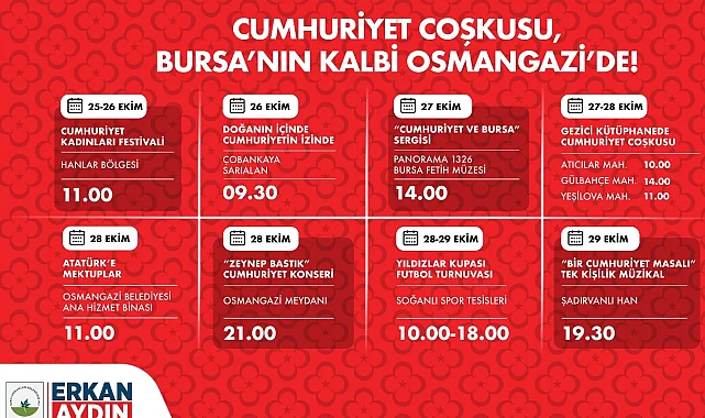 Osmangazi Belediyesi, Türkiye Cumhuriyeti'nin 102'nci kuruluş yıl dönümünü büyük bir coşkuyla kutlamak için kapsamlı bir etkinlik programı hazırladı. 29 Ekim Cumhuriyet Bayramı heyecanı; gösteri, konser ve sergi gibi birbirinden renkli etkinliklerle Osmangazi'nin dört bir yanında yaşanacak.