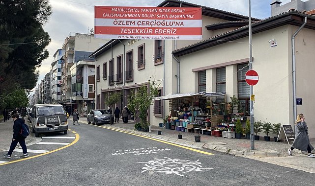 Aydın Büyükşehir Belediyesi Cumhuriyet Caddesi'ndeki yol yenileme çalışmasını tamamlayıp, vatandaşların hizmetine sunarken mahalle sakinleri de hazırlattıkları pankart ile Aydın Büyükşehir Belediye Başkanı Özlem Çerçioğlu'na teşekkür etti.