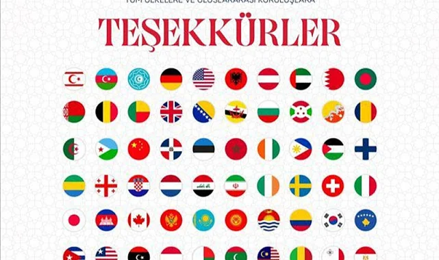 Cumhurbaşkanı Erdoğan'ın paylaşımında, tebriklerini ileten ülkelerin bayrakları ile uluslararası kuruluşların logoları da yer aldı.