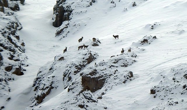 Erzincan'da Munzur Dağlarının karlı zirvelerinde dağ keçileri görüntülendi.