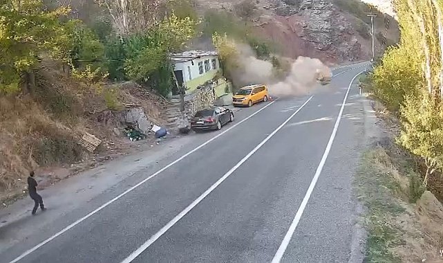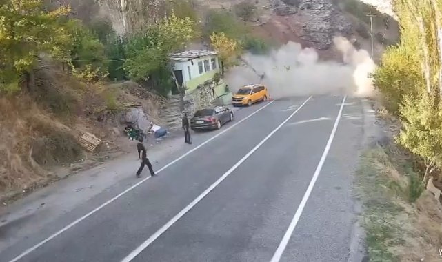 Tunceli'de çalışma yapıldığı sırada dağlık alandan kopan kaya parçası yola yuvarlandı. Facianın eşiğinden dönüldüğü olayda, kaya parçası dağ eteğinde bulunan ev ve park halindeki araçları teğet geçti. O anlar güvenlik kameralarına yansıdı.Olay, Tunceli-Erzincan karayolu Kutu Deresi mevkiinde meydana geldi. Edinilen bilgiye göre, dağlık alanda kepçenin çalışma yaptığı sırada, kopan büyük bir kaya parçası aşağı doğru yuvarlanmaya başladı. Kaya parçası dağ eteğindeki evi ve yol kenarında park halindeki 2 aracı teğet geçerek dereye yuvarlandı. O sırada bir şahıs koşarak kaçmaya başladı ve yere düştü. Büyük bir facianın eşiğinden dönüldüğü olay, güvenlik kameralarına yansıdı.