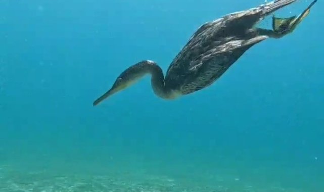 Antalya'da eğitim amaçlı dalış yapan dalgıçlar, avlanmak için suya girip bir anda karşılarına çıkan karabatak kuşunu görünce neye uğradığını şaşırdı. Dalgıçlar, karabatağın suya giriş ve balıkların peşinden gidiş anlarını su altı kamerası ile kaydetti.