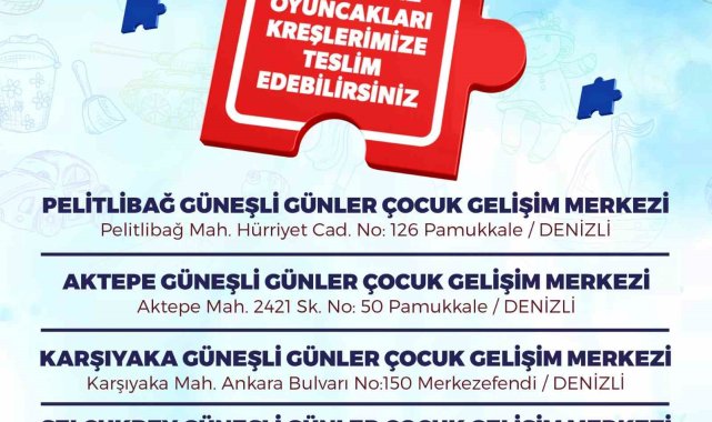 Denizli Büyükşehir Belediyesi, evlerde kullanılmayan oyuncakları, çocuk gelişim merkezlerinde eğitim alan çocuklarla buluşturmak amacıyla anlamlı bir sosyal sorumluluk kampanyası başlattı. Kampanya kapsamında, bağışlanan oyuncaklar belediyeye ait Güneşli Günler Çocuk Gelişim Merkezlerine teslim edilebilecek.