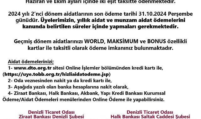 DENİZLİ (İHA) – Denizli Ticaret Odası (DTO), üyelerine 2024 yılı ikinci dönem aidatlarının son ödeme tarihinin 31 Ekim 2024 Perşembe günü olduğunu hatırlattı.