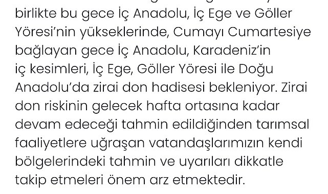 Denizli ve çevre illerde önümüzdeki hafta ortasına kadar etkili olması beklenen zirai don hadisesine karşı uyarı yapıldı.Meteoroloji 5. Bölge Müdürlüğü Bölge Tahmin ve Erken Uyarı Merkezinden yapılan son değerlendirmelere göre, Denizli ve çevre illerin yüksek kesimlerinde zirai don hadisesi bekleniyor. Hava sıcaklığının hissedilir derecede azalarak mevsim normallerinin altına düşeceği tahmin ediliyor. Buna bağlı olarak Meteoroloji 5. Bölge Müdürlüğü, zirai don riskinin gelecek hafta ortasına kadar devam edeceği tahmin edildiğinden tarımsal faaliyetlerle uğraşan vatandaşlarımızın kendi bölgelerindeki tahmin ve uyarıları dikkatle takip etmeleri konusunda tedbirli olunması gerektiğini bildirdi. Bölgedeki zirai don riskinin 18 Ekim Cuma gece 00.00'da etkisini göstererek 23 Ekim Çarşamba sabah 09.00' kadar süreceği belirtildi.