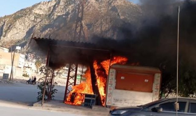 Hatay'ın Antakya ilçesinde esnaf Süleyman Küpeli'ye ait prefabrik iş yeri, alev alev yanarak kullanılamaz hale geldi.