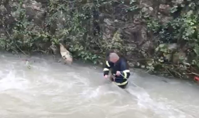 Kastamonu'nun Cide ilçesinde dereye düşen ve suya düşmek üzere olan köpek itfaiye ekipleri tarafından kurtarıldı.
