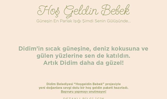 Didim Belediyesi'nin hayata geçirdiği "Hoş Geldin Bebek" projesi, ilçe genelinde büyük ilgi görerek devam ediyor. Dünyaya gelen her bebeğin sevincini ailelerle paylaşmak amacıyla hazırlanan özel hediye paketleri evlere teslim ediliyor.Proje hakkında değerlendirmede bulunan Didim Belediye Başkanı Hatice Gençay, yaptığı açıklamada, "Didim'de doğan her bebekle birlikte umutlarımız tazeleniyor, kentimizin neşesi artıyor. Yeni hayatların ilk adımlarına tanıklık etmekten büyük mutluluk duyuyoruz. Ailelerimizin yanında olmak ve bebeklerimize sevgi dolu hediyelerimizle 'hoş geldin' demek bizim için çok kıymetli" dedi.'Hoş Geldin Bebek' projesine başvuruda bulunmak için Didim Belediyesi Halk Masası ile iletişime geçerek başvuruda bulunabiliyor.