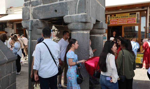 Diyarbakır'ın merkez Sur ilçesinde bulunan yaklaşık 540 yıllık Dört Ayaklı Minare'nin altından 7 kez geçen ziyaretçiler, dua edip dilek tutuyor.