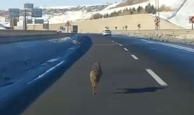 Diyarbakır'da ana yola inen bir kurt, uzun süre bir aracın önünde koştu