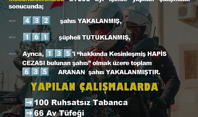 Diyarbakır'da polis ekiplerince eylül ayı içerisinde düzenlenen operasyonlarda aranan 635 şahıs yakalandı.Diyarbakır ve ilçelerinde eylül ayı içerisinde gerçekleştirilen operasyonlara ilişkin veri paylaşıldı. Buna göre, Diyarbakır İl Emniyet Müdürlüğü Asayiş Şube Müdürlüğü ile ilçede görevli polis ekiplerince düzenlenen uygulamalarda 432 şahıs yakalanırken bunlarda 161'i tutuklandı. Ayrıca 135'i kesinleşmiş hapis cezası bulunan şahıs olmak üzere 635 aranan şahıs yakalandı.Yapılan çalışmalarda 100 ruhsatsız tabanca, 66 av tüfeği, 29 kurusıkı tabanca 551 fişek ele geçirildi.