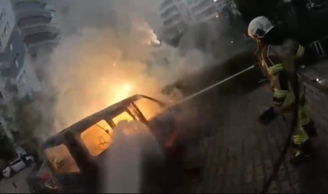 Diyarbakır'da bir sitede park halinde bulunan hafif ticari araç aniden alev aldı. Olay anı, itfaiye erinin kask kamerasına yansıdı.Olay, Kayapınar ilçesinde bulunan bir sitede yaşandı. Henüz bilinmeyen bir nedenden dolayı park halindeki hafif ticari araçta yangın çıktı. Yanan aracın yanında bulunan diğer otomobiller sahipleri tarafından alınırken, alevler metrelerce yükseldi. Alevlere ilk müdahaleyi vatandaşlar yangın söndürme tüpü ile yaptı. Haber verilmesi üzerine olay yerine 112 acil sağlık, itfaiye ve polis ekipleri sevk edildi. Apartmanda bulunan vatandaşlar tedbir amaçlı tahliye edilirken ekiplerin müdahalesi ile yangın kontrol altına alınarak söndürüldü. Olayda ölen ya da yaralanan olmazken, iki araçta büyük çapta maddi hasar meydana geldi.Öte yandan, aracın yanma anı kısa sürede olay yerine intikal eden itfaiye erlerinin kask kameralarına yansıdı. Görüntülerde, araçtan hızla inen itfaiye erlerinin yanan araca ve alevlerin sıçradığı diğer araca müdahale ederek yangını kısa sürede kontrol altına aldığı görülüyor.Yangının çıkış nedeni araştırılıyor.