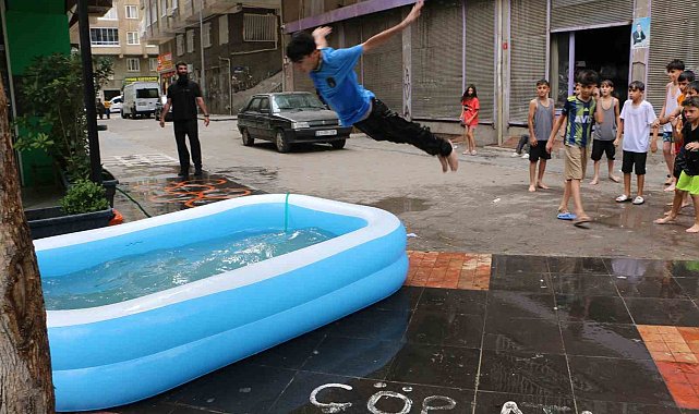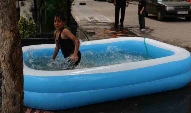 Diyarbakırlı esnaf sıcaktan bunalan çocuklara şişme havuz açtı