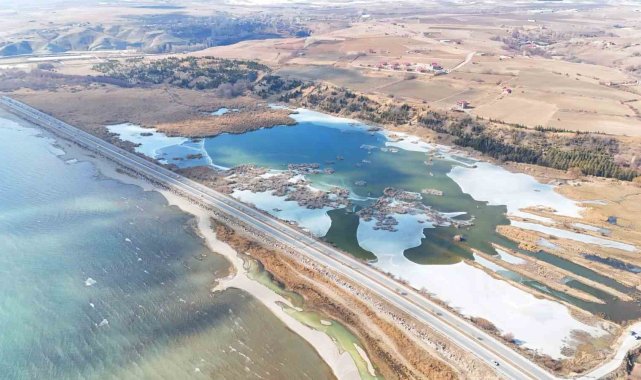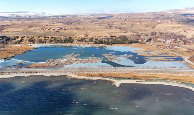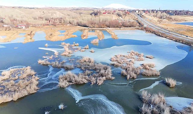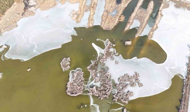 Bitlis'in Ahlat ilçesinde bulunan ve şiddetli soğuk nedeniyle kısmi olarak donan Vali Uğur Boran Kuş Cenneti havadan görüntülendi.