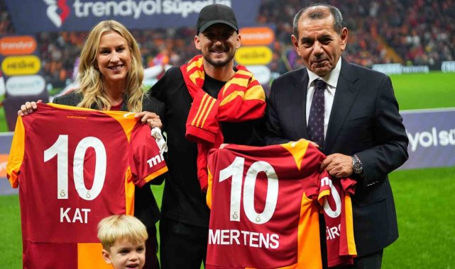 Galatasaray'ın eski futbolcusu Dries Mertens, ailesiyle birlikte Trabzonspor maçını izlemek için RAMS Park'a geldi. Müsabaka öncesinde Mertens ailesine plaket ve forma takdimi yapıldı.Trendyol Süper Lig'in 11. haftasında Galatasaray sahasında Trabzonspor ile mücadele ederken, sarı-kırmızılıların eski futbolcusu Dries Mertens de karşılaşmayı takip etti. Mertens, eşi Katrin Kerkhofs ve oğlu Ciro ile birlikte RAMS Park'a geldi.Plaket takdim edildiKarşılaşma öncesinde Galatasaray Başkanı Dursun Özbek, Dries Mertens'e emeklerinden dolayı plaket takdim verdi. Özbek, ayrıca Mertens ailesine arkasında isimleri yazılı Galatasaray forması da hediye etti. Daha sonra Mertens, oğlu Ciro ile birlikte kale arkasına giderek, taraftarlara 3'lü çektirdi.Belçikalı futbolcu, Galatasaray'da 136 maçta görev alırken, rakip fileleri 25 kez havalandırmıştı.Mertens, Galatasaray'dan geçtiğimiz sezon sonunda ayrıldıktan sonra futbolu bıraktı.