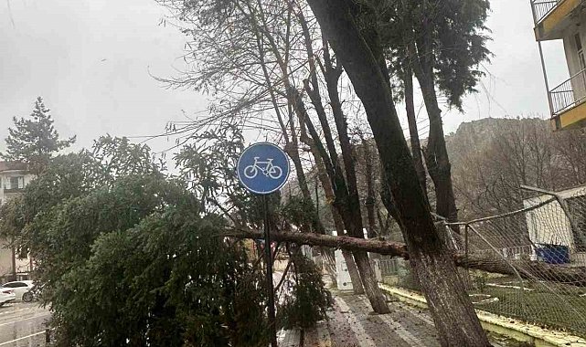 Balıkesir'in Dursunbey ilçesinde öğle saatlerinde aniden çıkan fırtına ilçe genelinde ağaçları ve çatıları uçurdu. Fırtına sonrası devrilen ağaç ve çatılardan otomobillerin üstüne düşen profiller hasar oluşturdu.Dursunbey ilçesinde öğle saatlerinde çıkan fırtına evlerin çatılarını ve ağaçları kırarak zarar verdi. Evin çatısı yoldan geçen otomobilin ön camından içeri girdi. Fırtına sonrası Belediye ekipleri sokak ve caddelerden kırılan ağaç ve uçan çatıları temizleyerek, güvenli geçişi sağladı. Dursunbey Belediyesinden yapılan açıklamada şu ifadelere yer verildi. "İlçemizde öğle saatlerinde etkili olan şiddetli fırtına sonrası meydana gelen olumsuzluklar, Belediyemiz Fen İşleri Müdürlüğü, Park ve Bahçeler Müdürlüğü, Zabıta ve diğer birimlerimizin koordineli çalışması ile giderilmektedir. Hava şartları sebebi ile tüm hemşehrilerimizi daha dikkatli olmaya davet ediyor, özellikle çatı ve açık alanlarda zaman geçirilmemesini öneriyoruz" açıklaması yapıldı.