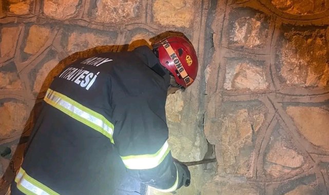 Duvar arasında mahsur kalan yavru kediyi itfaiye kurtardı